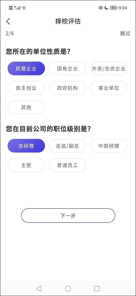 3、在择校评估第二栏选好所在单位的性质、任职公司的职位级别后点击下一步;