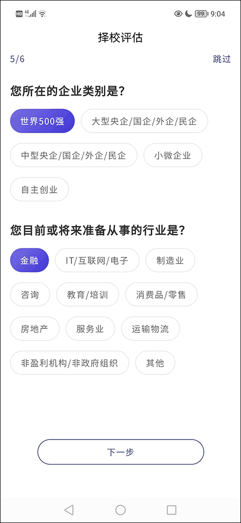 6、在择校评估第五栏选择好自己所在的企业类别、准备从事的行业后找到并点击“下一步”选项;