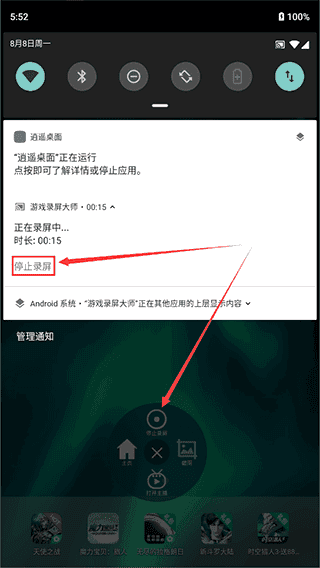 4、录制完成后可以在悬浮窗或者在状态栏点击【停止录屏】按钮,即可结束录屏;