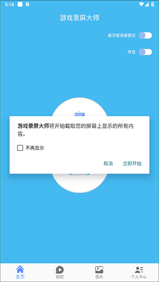 2、在录屏开始前,我们可以自由设置【悬浮窗录屏模式】、【声音】等功能,开启【声音】功能后,在录制时将会把你的声音给录制进去;