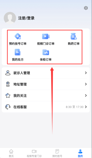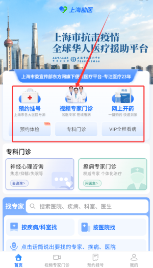 1、首页提供线上预约挂号、视频专家门诊以及互联网在线开药等核心医疗服务入口。