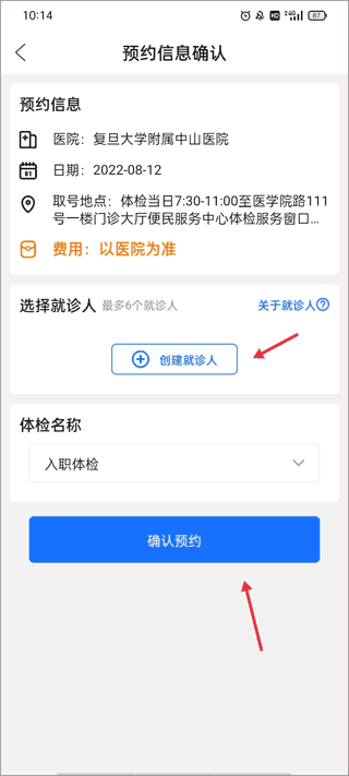 3、了解预约体检的信息,选择要就诊的人,最后点击“确认预约”。