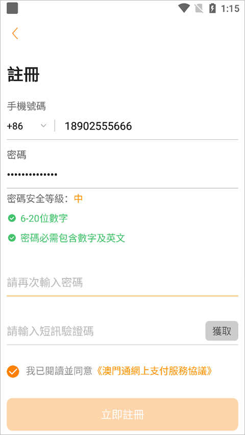 接着输入内地手机号,并设置密码,点击验证码获取按钮后获取并输入验证码,然后勾选同意相关协议后点击【立即注册】按钮