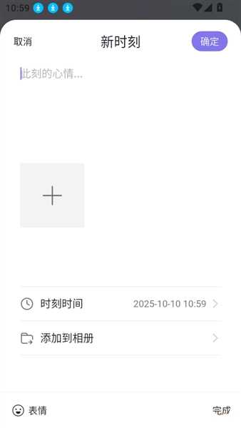5、如此就可输入此刻的心情时刻的内容和点击“方框+”来上传图片,之后点击“确定”按钮完成记录。