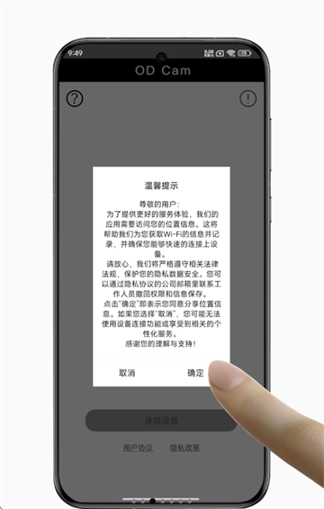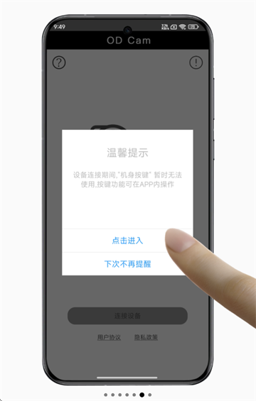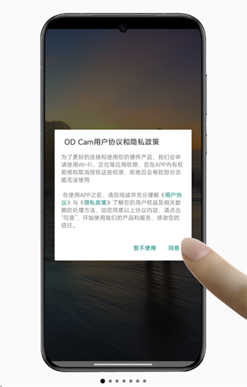 1、下载安装并打开od cam,先同意ODCam用户协议和隐私政策