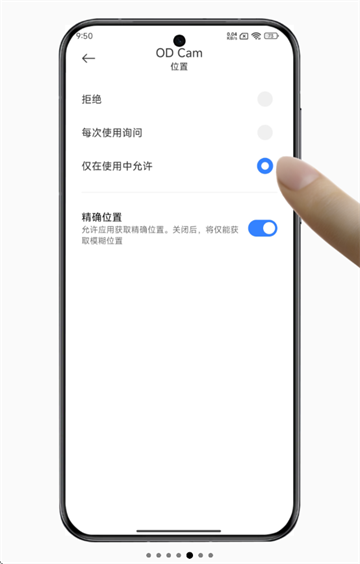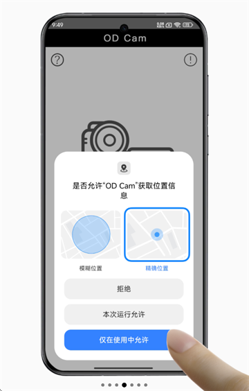 4、在是否允许“ODCam”获取位置信息提示界面中点击仅在使用中允许