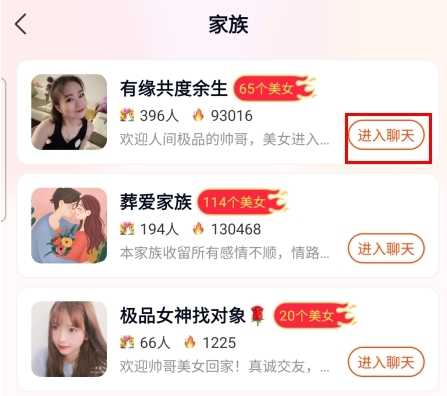 2、在家族页面中选择要加入的家族,点击进入聊天按钮;