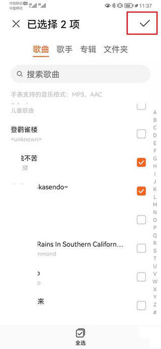 4、在添加音乐列表,勾选具体音乐后,点击右上角【√】确认即可。