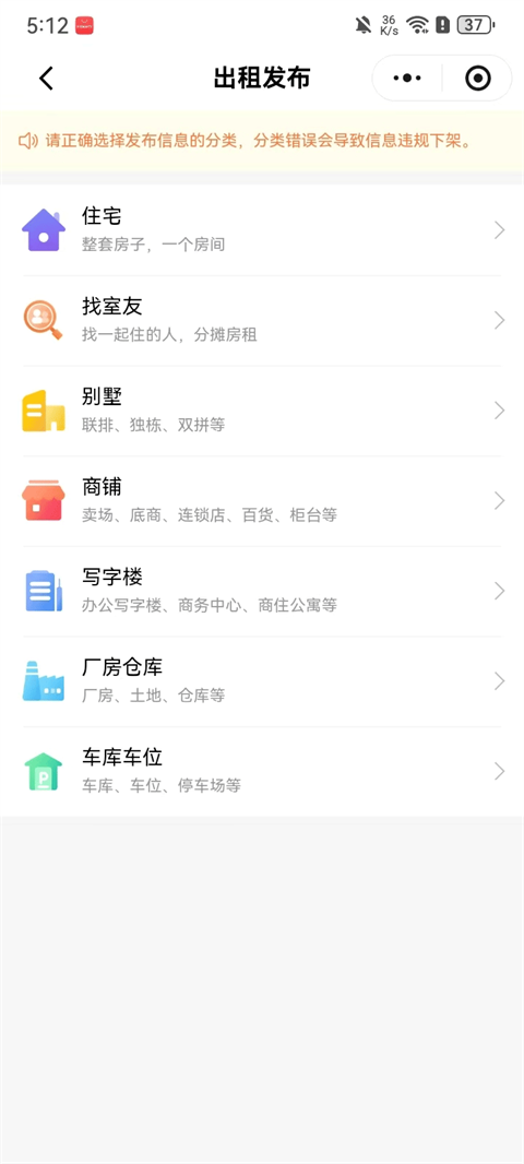 2、同步进入微信小程序,选择发布类别,如买房卖房、租房求租等需求;