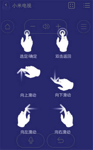 3、点击“小米电视(192.168.1.37)”,可以看到悟空遥控的主界面,非常简洁。常见的选择键、确定键、菜单键、主页键、返回键、音量键。下方是功能选择栏。右上方分别是切换手势遥控器和更多设置按钮