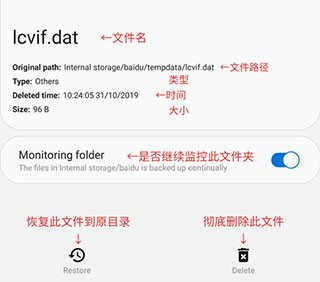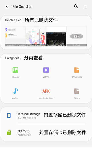 效果很像PC上的回收站功能,通过在后台持续全局监控手机存储变化,当有文件被删除,等情况时,将文件移到文件卫士里面统一管理。