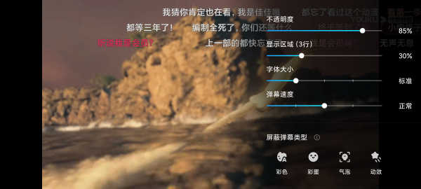 3、自由对于弹幕的显示区域、字体大小、速度等等进行设置。