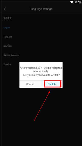 5、弹出选项后,点击右边的【Switch】切换,然后等待YOUKU App重启即可完成设置。