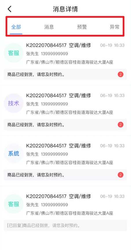 4、进入“消息”页面可筛选查看各类通知与预警提醒。
