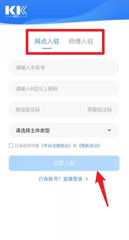 1、输入手机号和验证码,完成平台账号注册并选择主体类型。