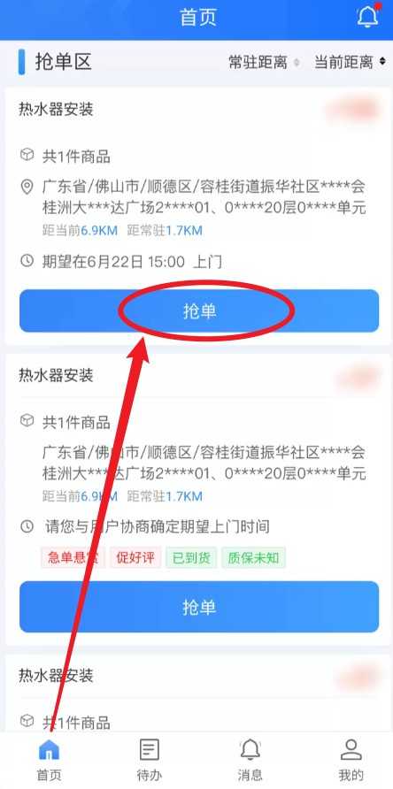 2、点击“抢单”按钮可接取附近的待处理订单任务。