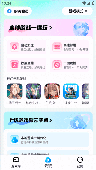 1、我们点击下面的云玩,点击右上角的游戏模式。