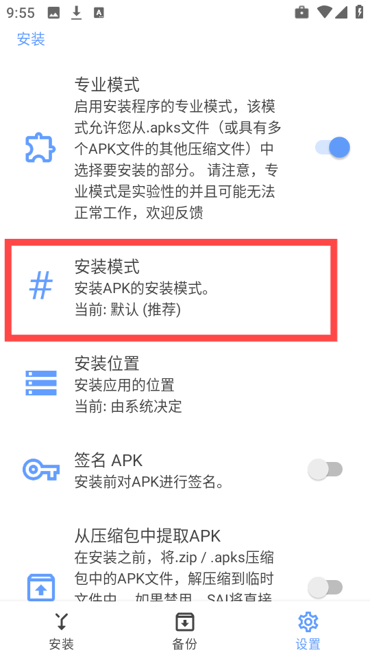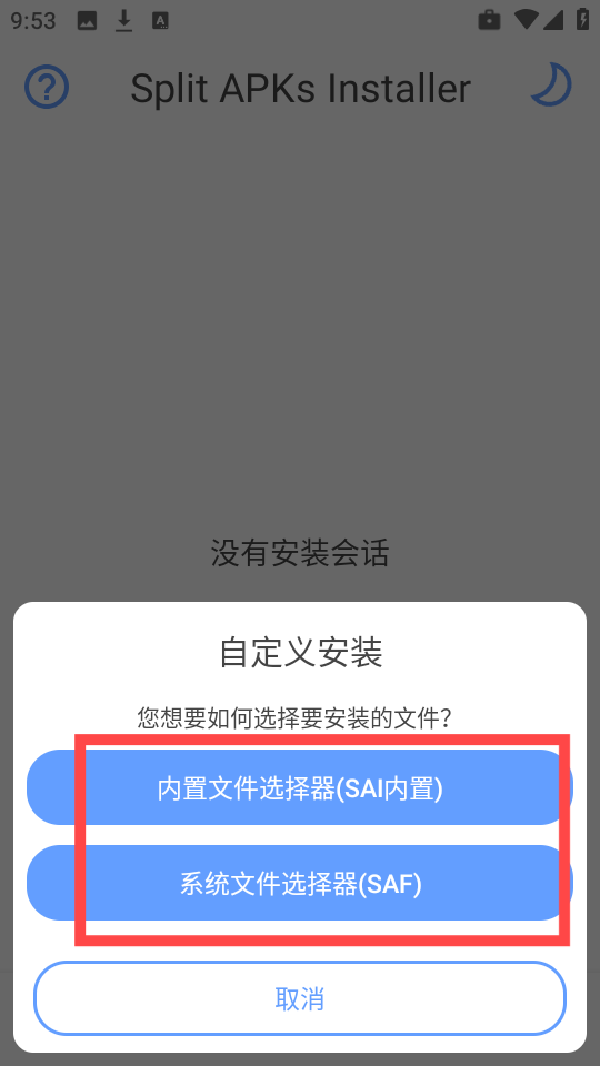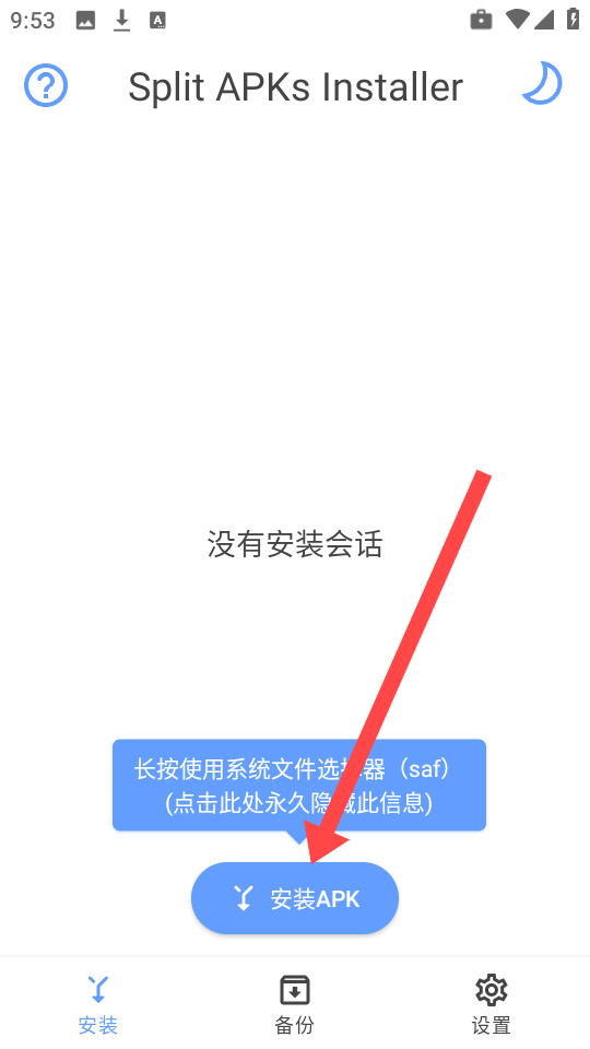 .apks你可以将包含全部Split Apk(分包Apk)的.zip压缩包重命名为.apks后缀名,此操作可以(从其他应用,如文件管理器、下载管理器...)直接打开SAI。长按“选择”使用系统文件选择器(SAF),而不是SAI内置选择器。