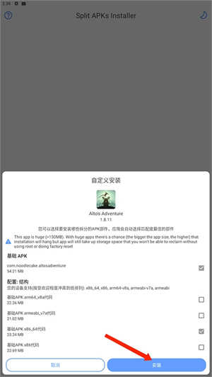 点击"安装APKs",选择base APK以及需要的Config APK 或包含以上全部.zip/.apks压缩包,然后点击“安装”。