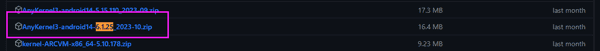 1、首先在github上下载和你设备内核版本一致的AnyKernel3 包。比如 小米 14Pro 的内核版本是 6.1.25-android14 ,这里下载一样的版本,名字前面带 AnyKernel3 的。