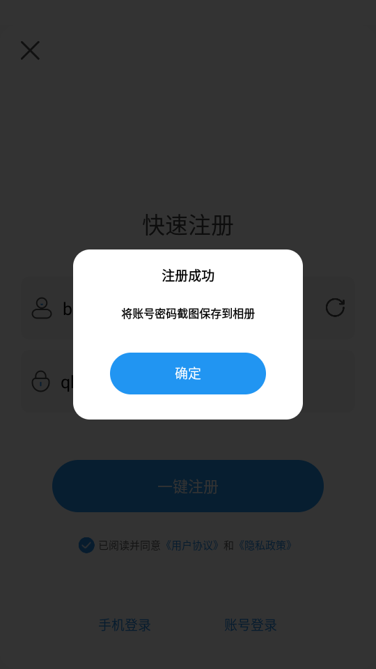 2、这个时候需要自定义进行登录,会随机生成一个账号,密码,直接点击“注册”即可。
