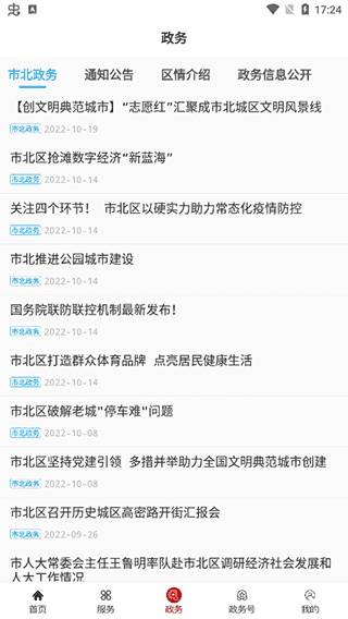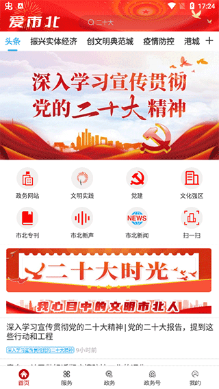 1、首页界面提供了政务网站,文明实践,党建,文化强区,市北专刊,市北新声,市北新闻等功能