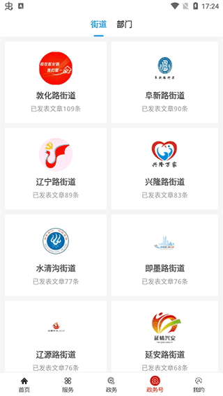 4、政务号界面可以查看各个街道各个部门的文章信息。