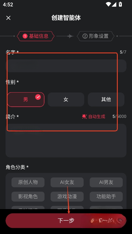 3、再接着自定义输入名字,性别,简介等,点击【下一步】。