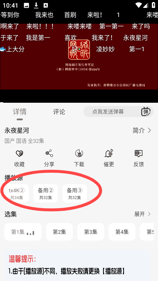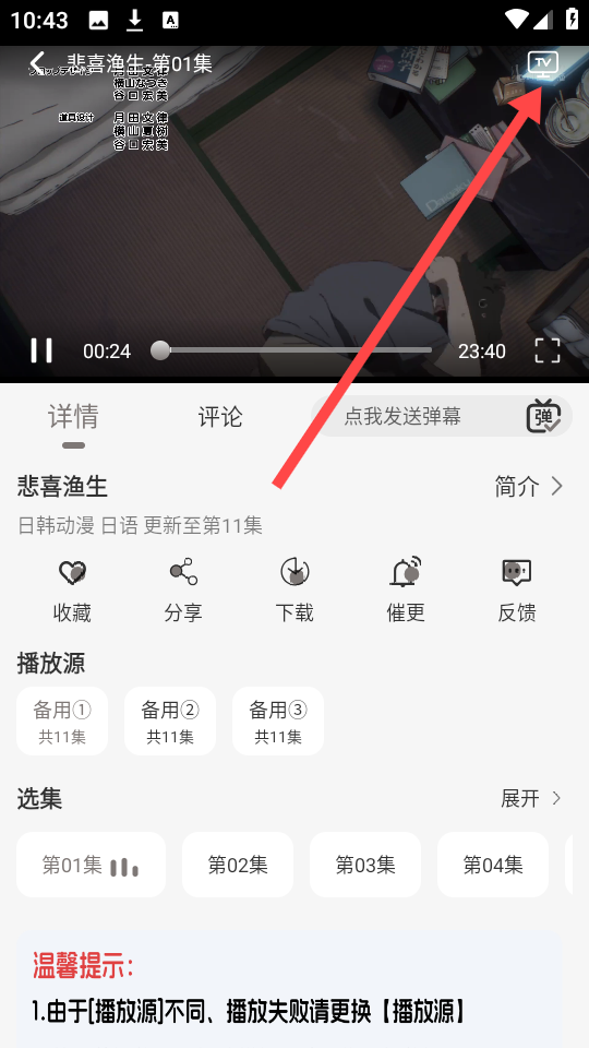 2、若当前播放不顺畅或模糊、请切换【播放源】。