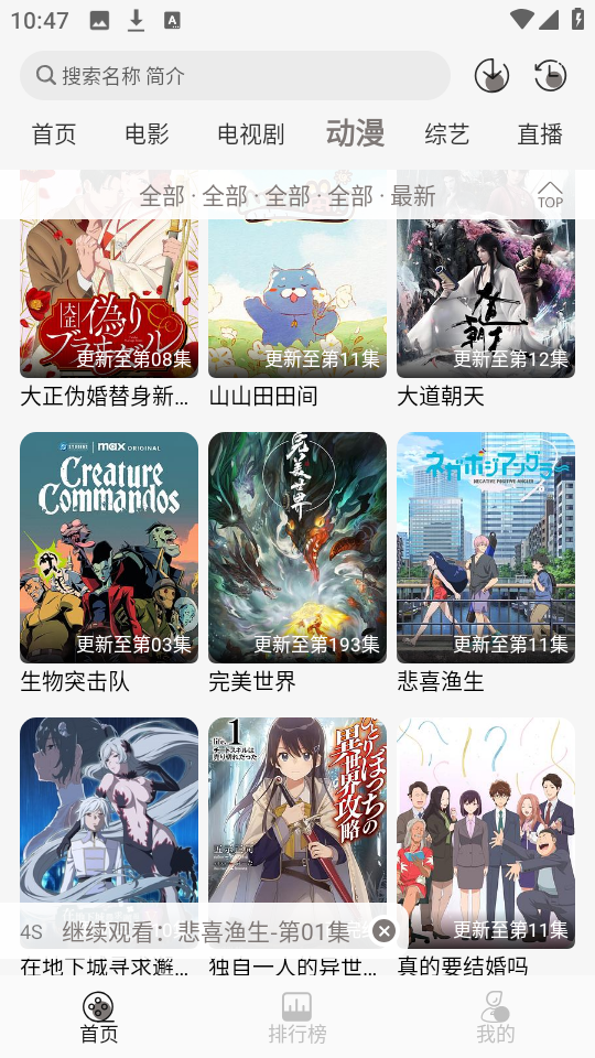 2、这里以动漫“悲喜渔生”为例,找到右上角的“tv”标志。