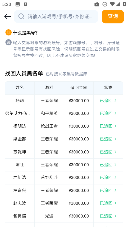 输入交易对象的游戏账号,如游戏账号、手机号、身份证号等显示账号有找回风险,说明该账号在过去交易的时候曾被号主找回过,因此不建议买家继续交易。
