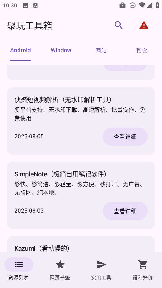 聚玩工具箱是一款安卓手机必备的手机工具箱软件,里面拥有着海量好用的小工具。并且还提供了众多应用资源可以下载,覆盖了下载工具、音乐、动漫和日常等多个方面。提供资源消息推送、1000+书签网站、实用小工具以及福利好价信息,众多功能后续会逐步上线。适用范围广泛,所有的功能都是可以免费进行使用的,页面简洁,使用过程中无广告弹窗。