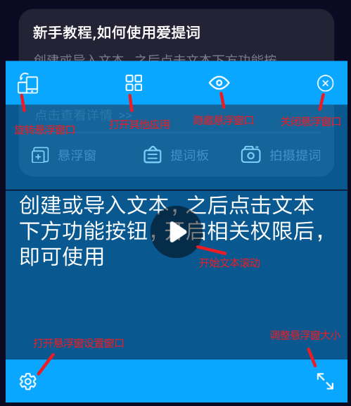1、可悬浮于任意app之上,自由移动、缩放提词面板,自动调节滚动速度,轻松录制视频。