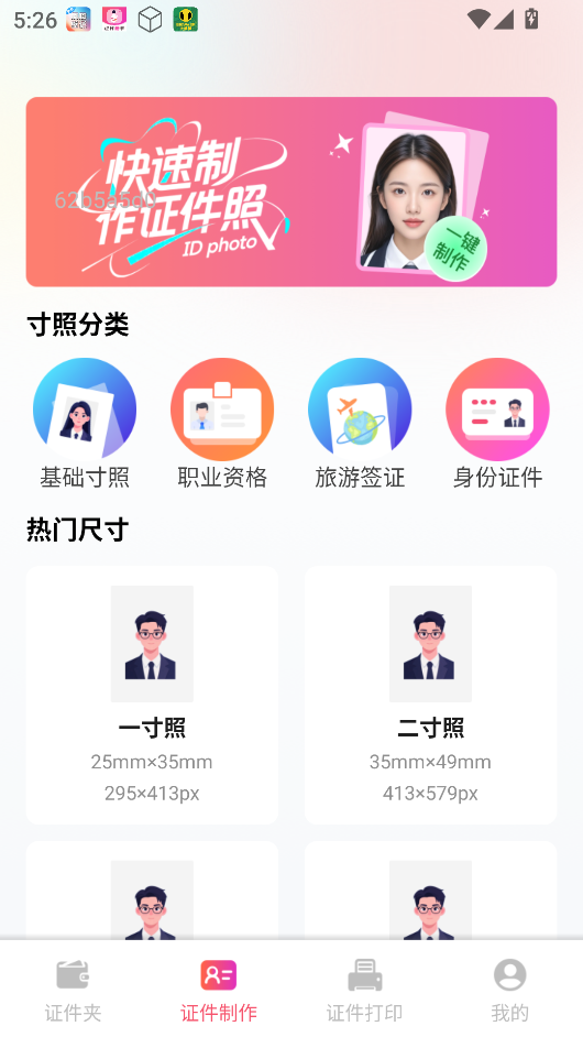 4、证件制作页面可选择证件照类型、尺寸进行制作。
