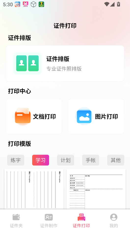 5、证件打印页面可以进行证件排版、打印,还有许多打印模板。