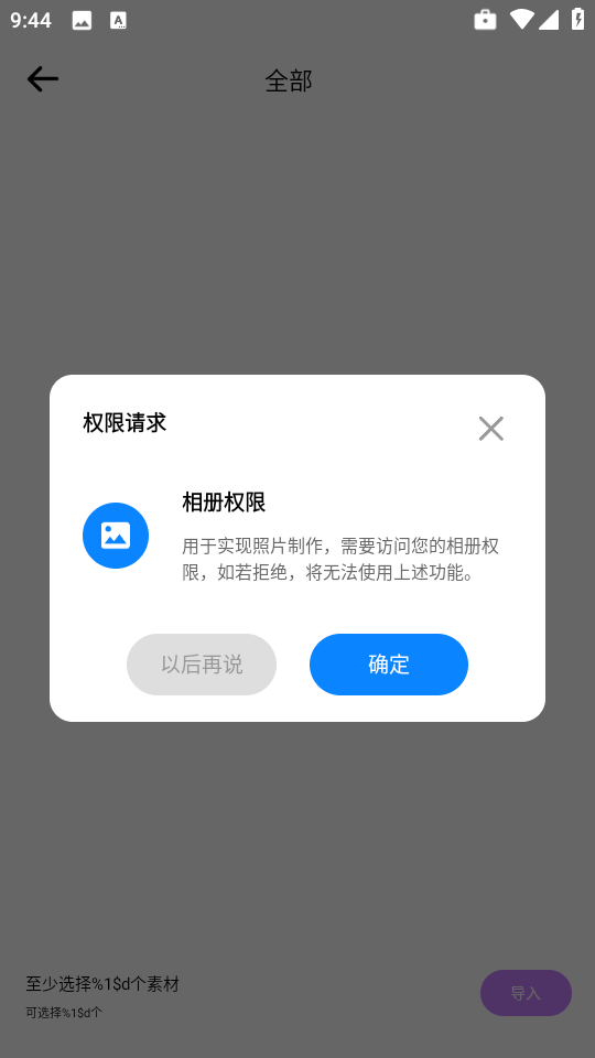 4、任意选择一款喜欢的拼图模版,第一次使用,需要允许相关权限功能,点击“确定”。