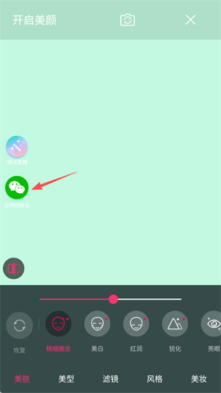 3、调试成功后,回到首页点击开启美颜,点击应用到微信