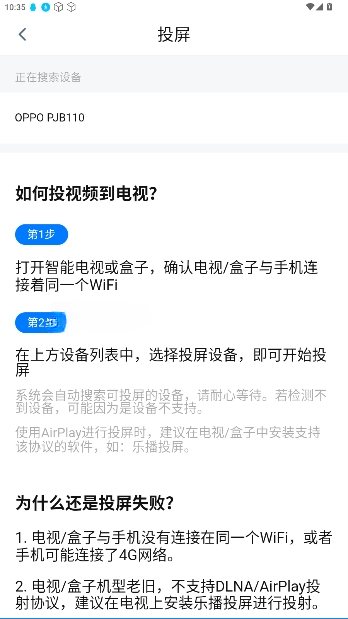 1、电视/盒子与手机没有连接在同一个WiFi,或者手机可能连接了4G网络。