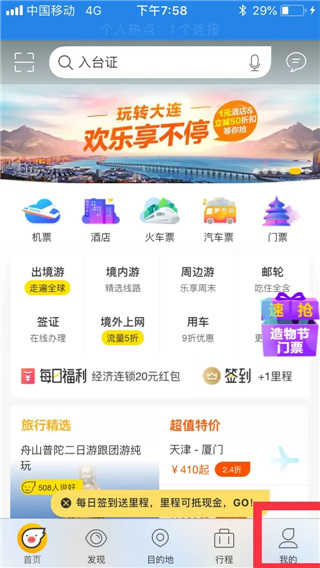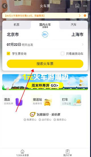 1、下载并安装打开飞猪购票app。进入该软件后,首先在“我的”这一栏登入,可以选择用淘宝或者是支付宝登陆。然后可以在主界面看见火车票这一选择,点击并进入。