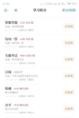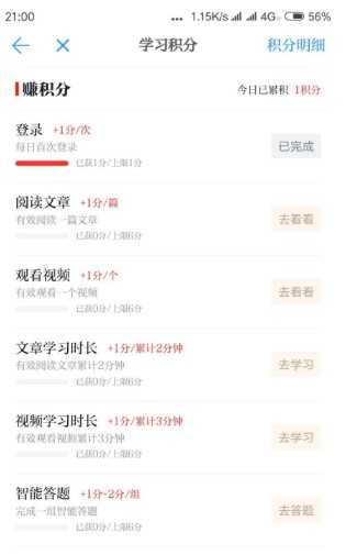 2、在学习积分中,有许多的学习增长得积分方式,比如我们看文章和视频,具体方式如这两张图,我们可以点击旁边的去看看等提示就可以进行增长积分途径;