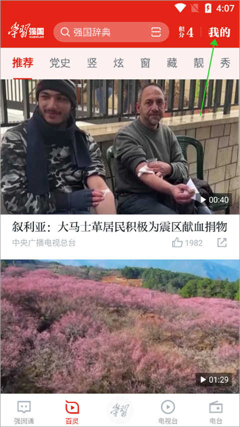 上述的一句话是摘自官方说明中的内容,用户可以通过点击强国平台app顶部页面中的【我的】(下图绿色箭头所指区)
