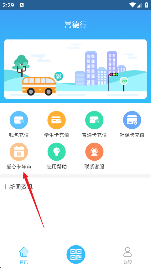 1、打开常德行App,在首页找到并点击【爱心卡年审】入口。
