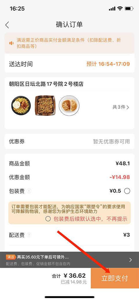 2、进入确认订单界面,确认完成,选择右下角“立即支付”选项,