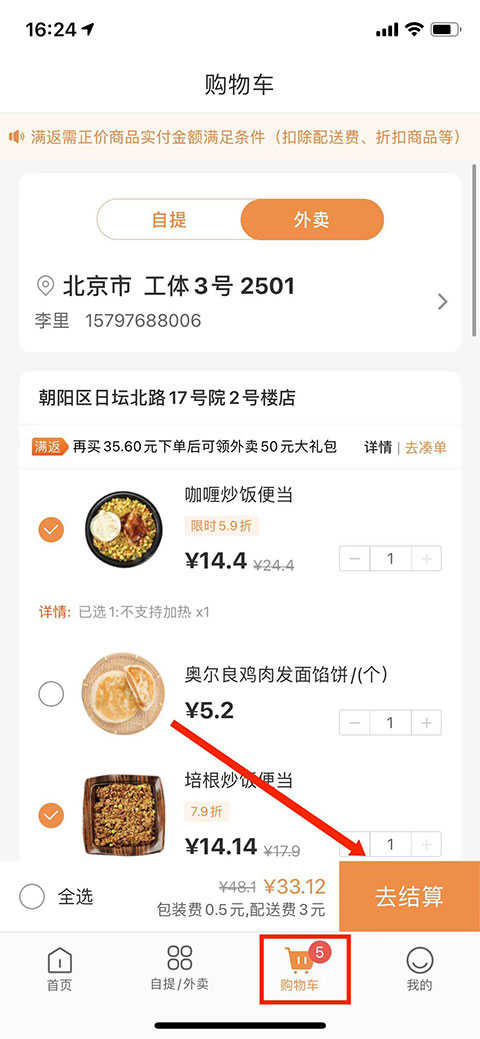 1、打开蜂便利app,在购物车界面,勾选需要购买的商品,选择右下角“去结算”选项,