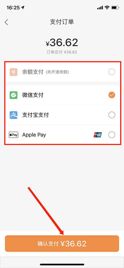 3、进入支付订单界面,根据需要勾选“余额支付”、“微信支付”、“支付宝支付”和“Apple Pay”支付方式,最后选择“确认支付”即可。