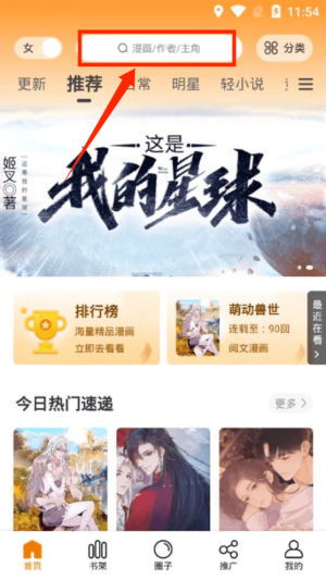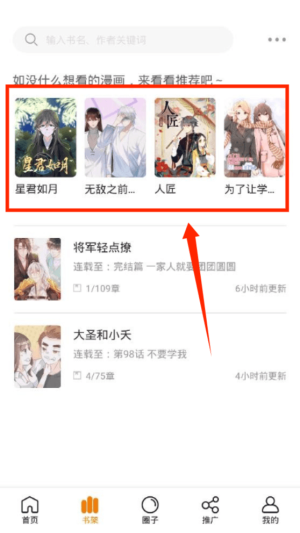 1、进入应用首页,可在上方搜索栏输入作品名或作者名直接检索。