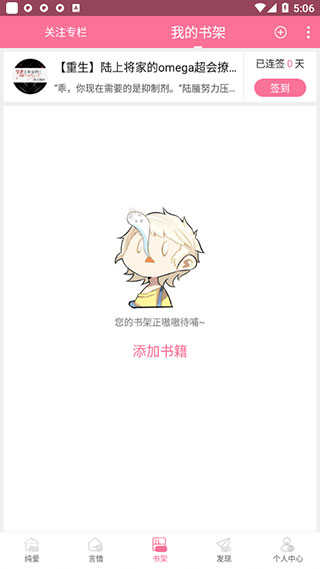 3、点击下方第三个模块“书架”进入,在里面可以进行签到,以及添加书籍。