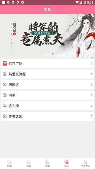 1、首先下载安装书耽小说,进入软件之后,在其中选择“言情”或“纯爱”即可切换为首页,如下图。