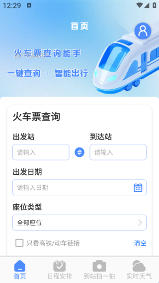 2、成功进入首页之后,自定义输入出发站、到达站以及出发日期即可。