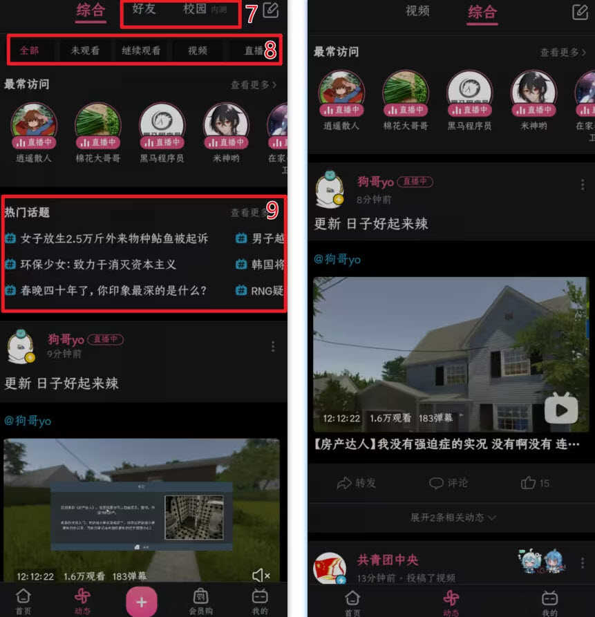 哔哩哔哩国际版只有3栏(首页、动态、我的),而国内版有5栏。